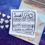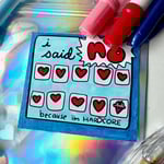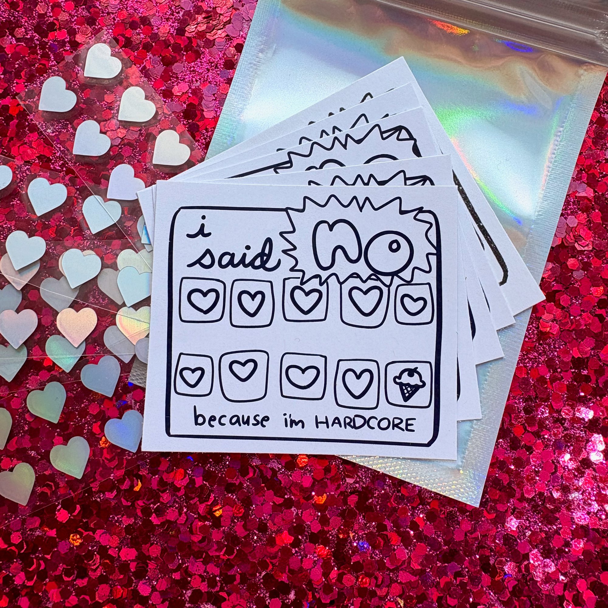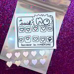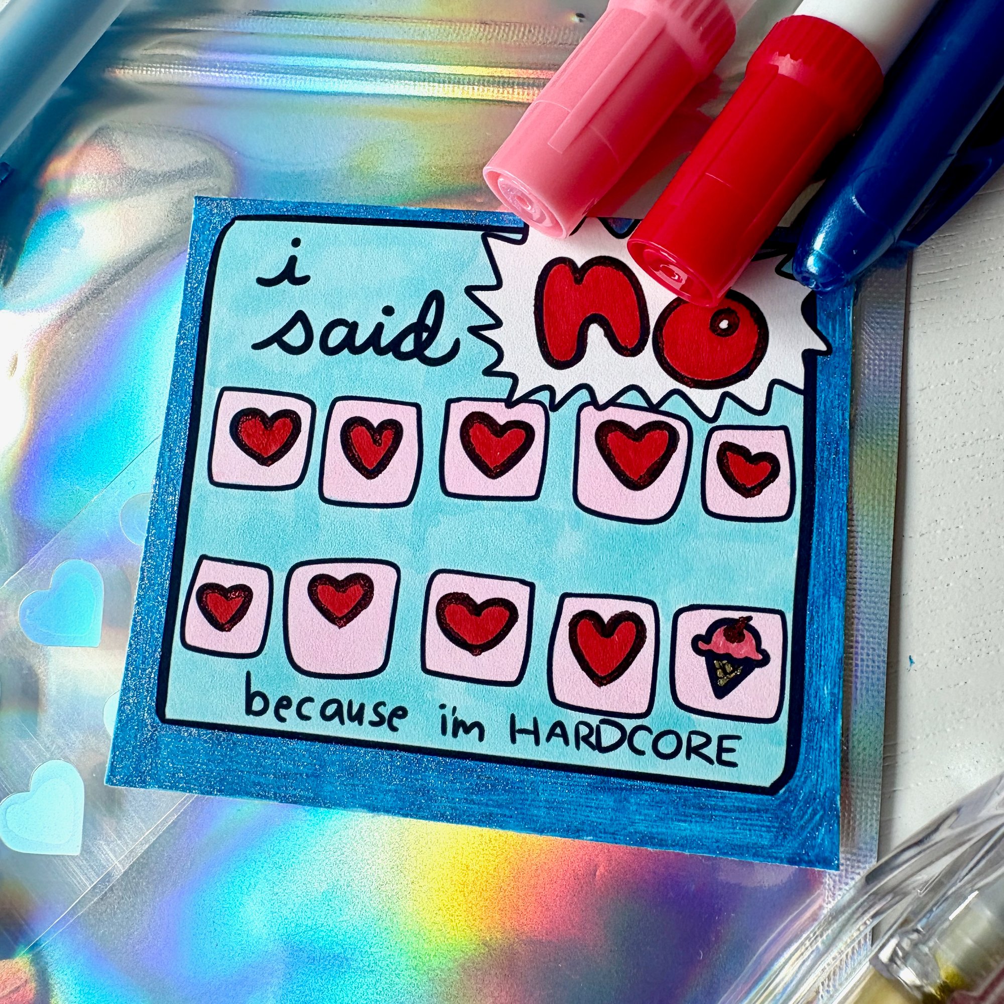 You are a big brave beautiful refusal monster, and you deserve treats. Each wallet-sized punch card is printed on sturdy cardstock, ready for you to color in (or not! Say no to us! Get that sticker!) and fill out with the included iridescent mini heart stickers.